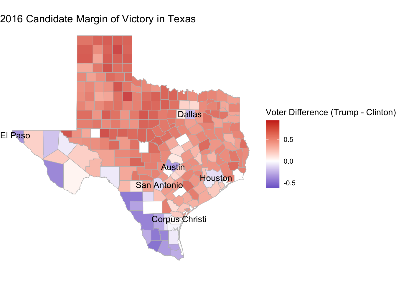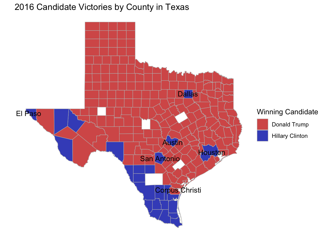 The first visualization we wanted to look at from our data was to see which candidates won each of the different counties in Texas and the margin of victory held in each county.