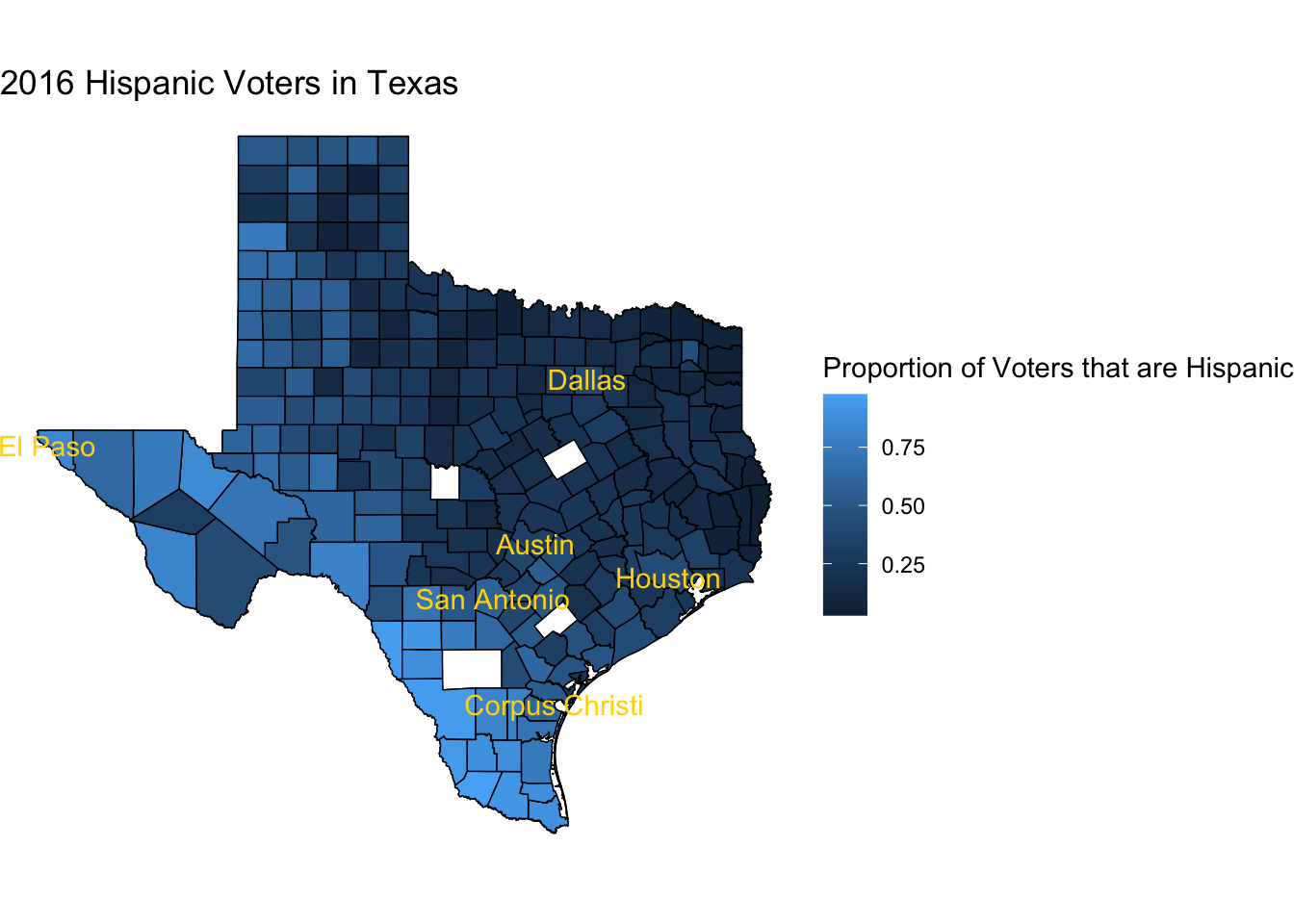 As you can see, many of the counties voted in favor of Republican Donald Trump, which is not a surprise seeing that Texas as a state has leaned Republican in every Presidential election since 1976 when Jimmy Carter won there. However, what we do notice is that around metropolitan/city centers, more people voted for Clinton, but more surprisingly, many along the Texas-Mexico border also voted in favor of Hillary Clinton. These counties became a focus for us as we began to look deeper into the results of the election. (Also there are counties on these maps that are white and that is because these counties did not have enough data in the census for us to include them in our analysis.)