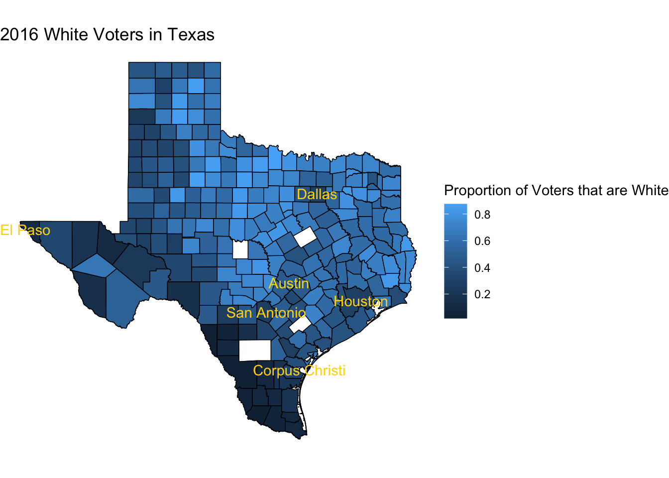 These maps give a very stark representation into where the two predominant race/ethnicities, White and Hispanic, are located in Texas. The further Southwest or closer the counties are to the Mexican border, we see a higher proportion of voters that are Hispanic and the farther Northeast or farther away from the border, we see a higher proportion of white voters. While this may make a lot of sense, I want you to keep this in mind as we look at our next visualization set.